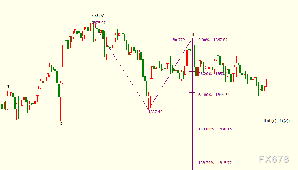 小时图上看,金价处于自1868美元开启的下行iii浪中,100%目标位和138.2%目标位分别在1830美元和1816美元。iii浪是自1875美元开启的下行(c)浪的子浪。(c)浪的38.2%目标位在1815美元。