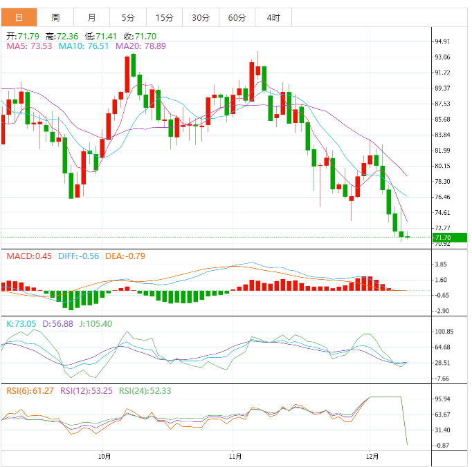 今天的预期交易区间在70.00支撑位和73.64阻力位之间。
