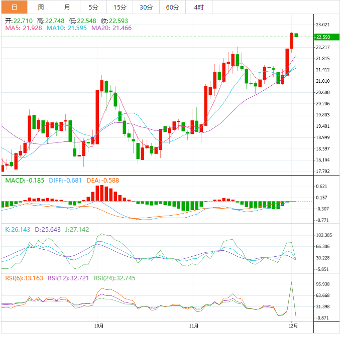 然而,自11月11日以来,银价在22.00美元关口附近形成了一个由多个水平位组成的水平区域,限制了银价的短期下行空间。
