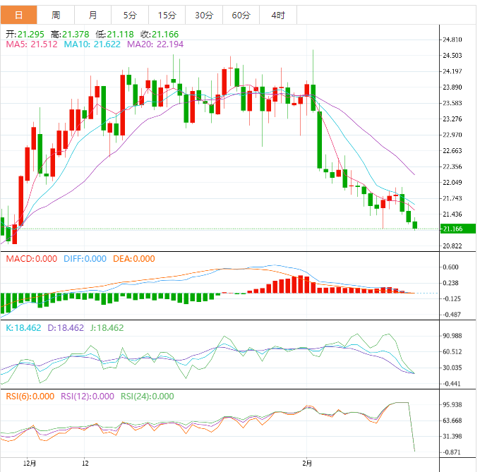 白银周五进入看跌盘整阶段,欧洲盘早盘在窄幅交易区间震荡。目前白银位于21.30- 21.25美元区间,略高于上周触及的年初至今低点,且似乎有进一步下滑的可能。
