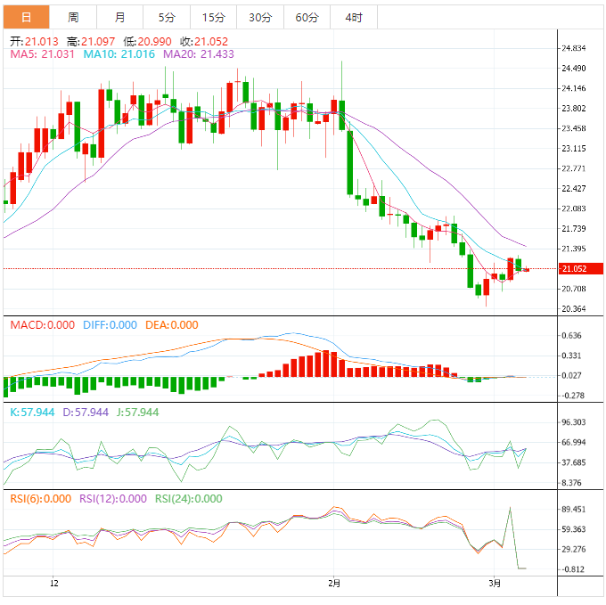 白银价格未能延续上周五的涨势,从约21.30美元的周高点回落,并在周一下跌0.92%或0.20美分。截止目前,白银价格为21.02美元,低于其开盘价。