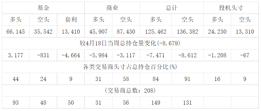 美国商品期货交易委员会(CFTC)最新公布截止4月25日当周COMEX白银期货分类持仓报告: