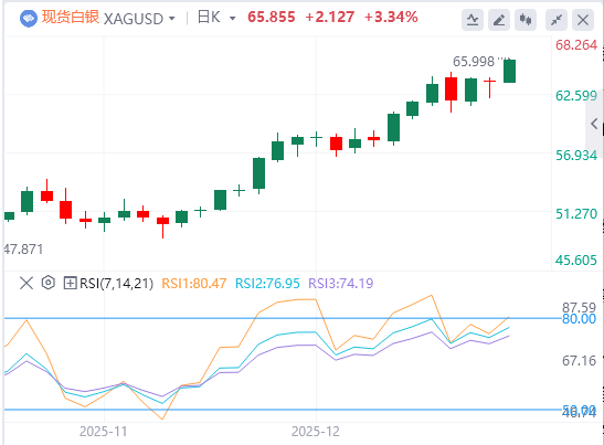 白银价格在亚洲交易时段上涨近3%,约为66美元。20期指数移动平均线(EMA)上涨至63.28美元,价格保持高于平均线,保持短期积极基调。