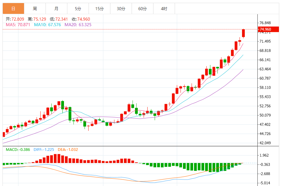 周五(12月26日),现货白银目前位于74.991美元/盎司附近,涨幅为4.45%。