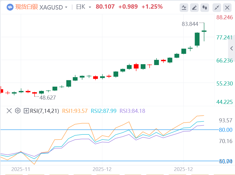 12月29日,周一欧市初盘,白银价格从开盘时的84.03美元历史高点回落至接近75.00美元。随着美国总统唐纳德·特朗普暗示俄乌和平谈判取得进展,白金属放弃盘中涨幅并略微转为负面。