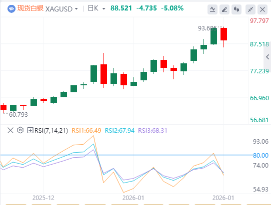 1月15日,周四亚市盘中,白银价格调整近6%,至接近86.50美元。在美国总统唐纳德·特朗普表示伊朗已保证停止杀害抗议者,且无大规模民事处决计划后,白银从周三发布的93.51美元历史高点回落,导致避风港需求下降。