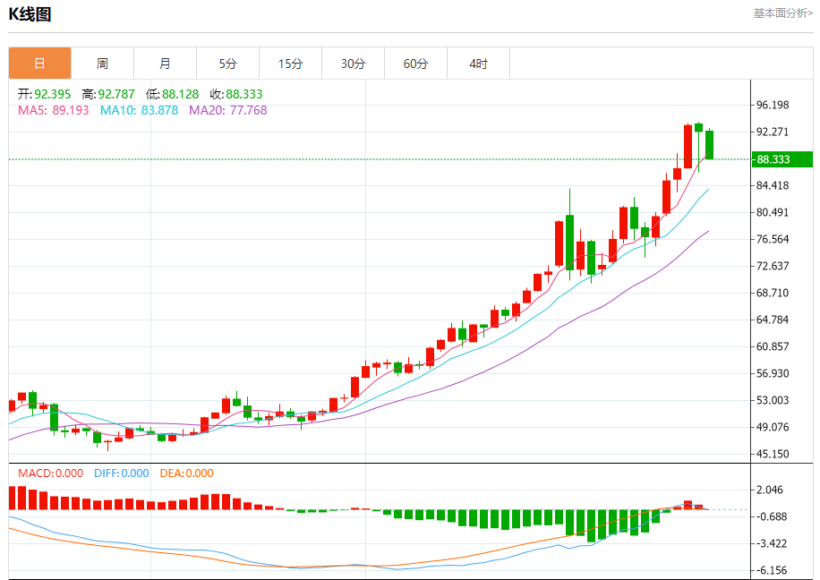 周四盘中,现货白银报89.210,跌幅4.32%。