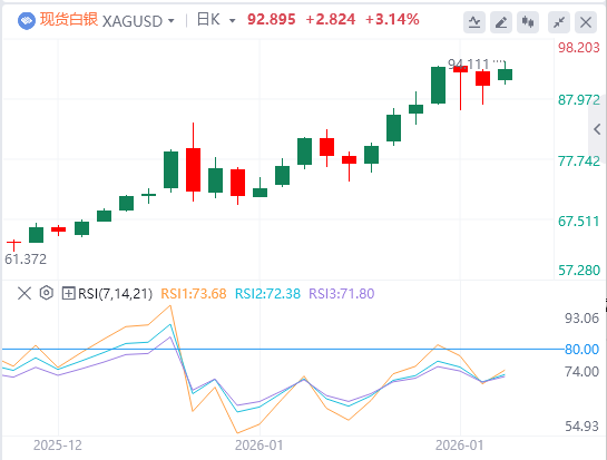 1月19日,周一亚市盘中,白银在92.89美元附近处于正区间。随着美国总统唐纳德·特朗普的关税威胁推动了避险资金流入,白金属将创下新的历史新高。美国市场因纪念马丁·路德·金纪念日周一休市。