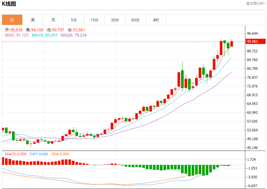 周一盘中,现货白银报93.008,涨幅3.29%。