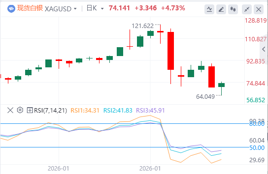 2月6日,白银在周五欧洲早盘收缩了一些跌幅,截至撰写时价格正好高于74.00美元,此前当天早些时候曾触及64.00美元附近的新低。然而,白银仍被限制在之前支撑区附近,约75美元。
