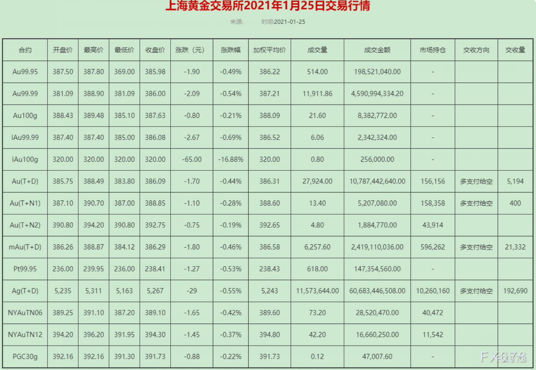 上海黄金交易所2021年1月25日交易行情,黄金T+D成交量27.924吨;