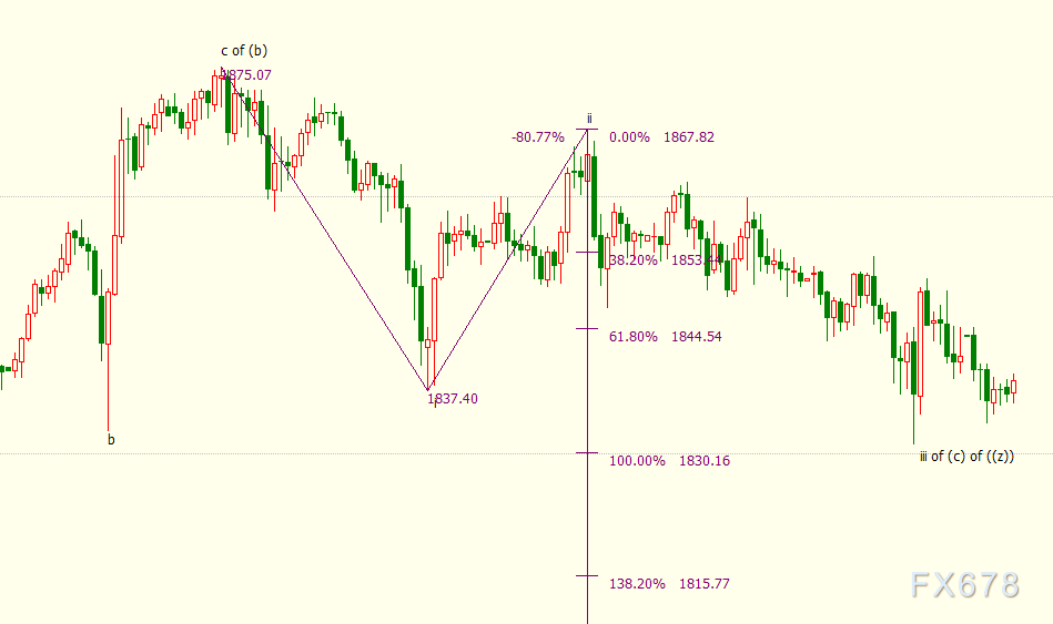 小时图上看,金价处于自1868美元开启的下行iii浪中,100%目标位和138.2%目标位分别在1830美元和1816美元。iii浪是自1875美元开启的下行(c)浪的子浪。(c)浪的38.2%目标位在1815美元。