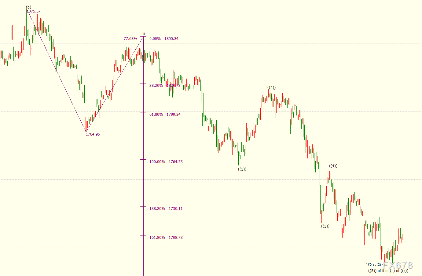 小时图上看,现货黄金处于自1855美元开启的下行iii浪中,金价似乎在185.4%目标位1687美元获得支撑,并可能开启反弹iv浪走势,上方目标看强1730美元。iii浪是自1876美元开启的下行(c)浪的子浪。反之,若iii浪继续扩大,下方支撑看向iii浪200%目标位1674美元和(c)浪138.2%目标位1657美元。