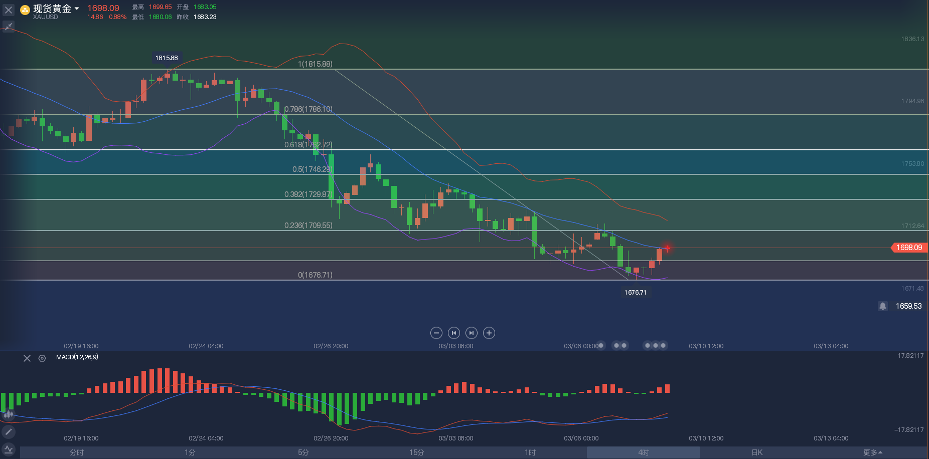 其次,通过对黄金四小时走势的观察不难发现,黄金近期一直是震荡下行,这和2月份的原油一样,每下跌到一个新低点就会出现一波反弹,像下楼梯一样,并不是直接下行,因此,黄金反弹之后,继续走低的概率很高。这里便可以借助布林带和斐波那契指标,找到该段反弹行情的回调位,以回调作为压力进行空单操作。