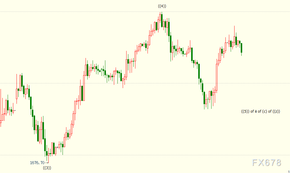 日线上看,iii浪和潜在iv浪是自1876美元开启的下行(c)浪的子浪,(c)浪是自1959美元开启的下行((z))浪的子浪。((z))隶属于自2075美元开启的4浪调整走势,4浪呈现((w))((x))((y))((x))((z))三重“之”字调整模式。((z))浪料将重新跌破138.2%目标位1681美元,并进一步下探161.8%目标位1633美元。