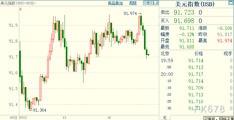 北京时间19:58,现货黄金微跌0.02%至1731.17美元/盎司;COMEX期金主力合约微升0.05%至1729.8美元/盎司;美元指数下挫0.08%至91.709。