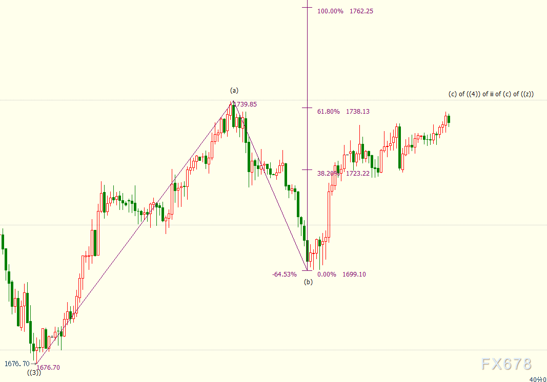 小时图上看,现货黄金处于自1699美元开启的反弹(c)浪中,已触及61.8%目标位1738美元,100%目标位上看1762美元。(c)浪属于自1676美元开启的反弹((4))浪走势。((4))浪是自1855美元开启下行iii浪的子浪。