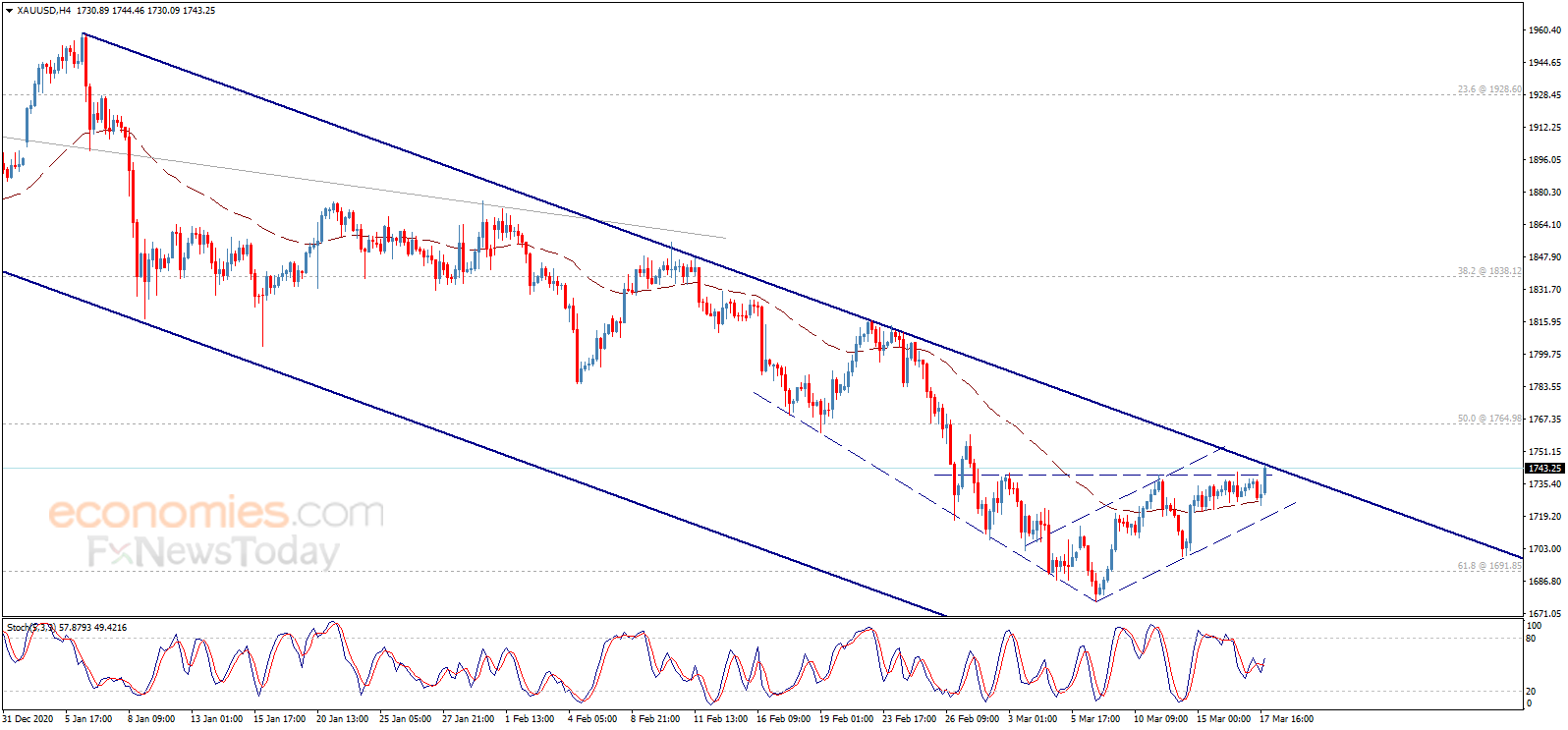 Economies.com在文章中写道,金价周三反弹突破1739.00美元/盎司,并维持在这一水平上方,这暗示金价未来几个交易日将处于看涨情景。