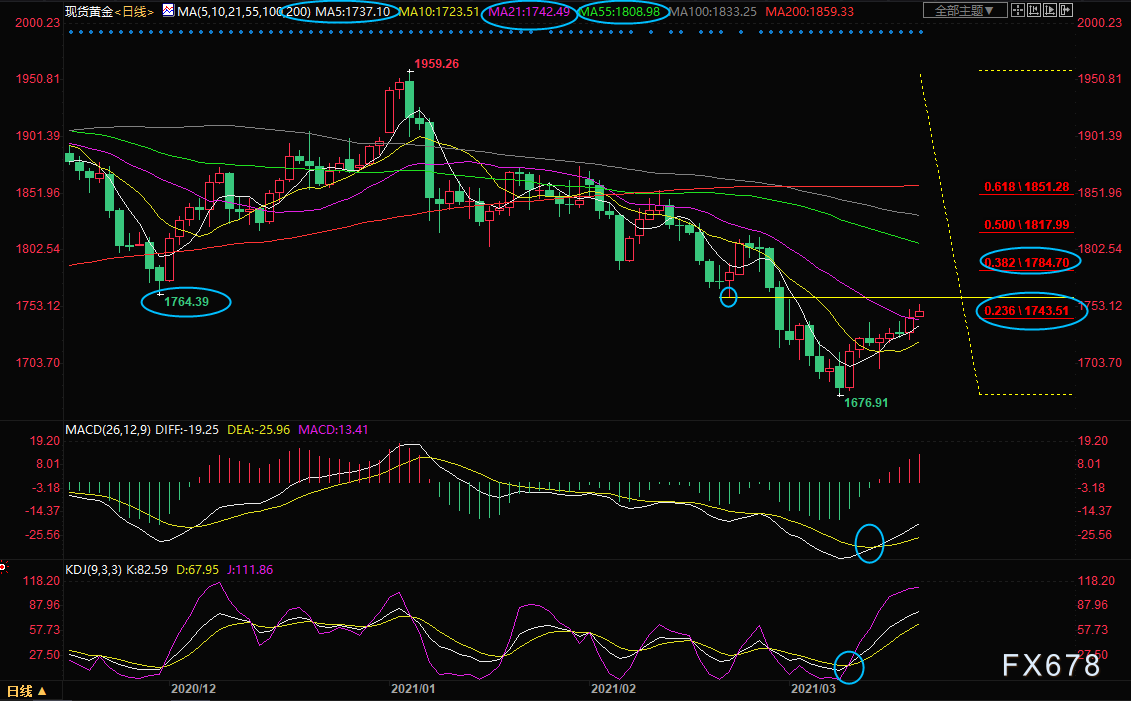 日线级别:单边下跌后反弹;MACD金叉,KDJ金叉,5日均线上穿10日均线形成金叉,金价顶破1740关键位置,也顶破21日均线和23.6%回撤位1743.51附近阻力,目前正试探2月19日低点1760附近阻力,如果进一步上破,则看向38.2%回撤位1784.70附近。