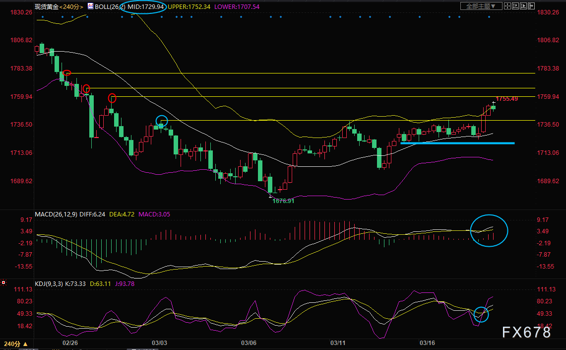 4小时级别:低位震荡后初步上破;金价顶破了1740关键位置,MACD金叉,KDJ金叉,布林线轻微开口,金价后市有望沿布林线上轨向上运行,初步阻力在1759.85附近,然后是1767.10附近阻力,较强的阻力在1779.54附近。