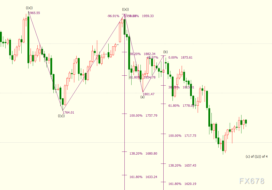 日线上看,iii浪是自1876美元开启的下行(c)浪的子浪,(c)浪的138.2%目标位在1657美元。(c)浪是自1959美元开启的下行((z))浪的子浪。((z))浪的161.8%目标位在1633美元。((z))浪隶属于自2075美元开启的4浪调整走势,4浪呈现((w))((x))((y))((x))((z))三重“之”字调整模式。