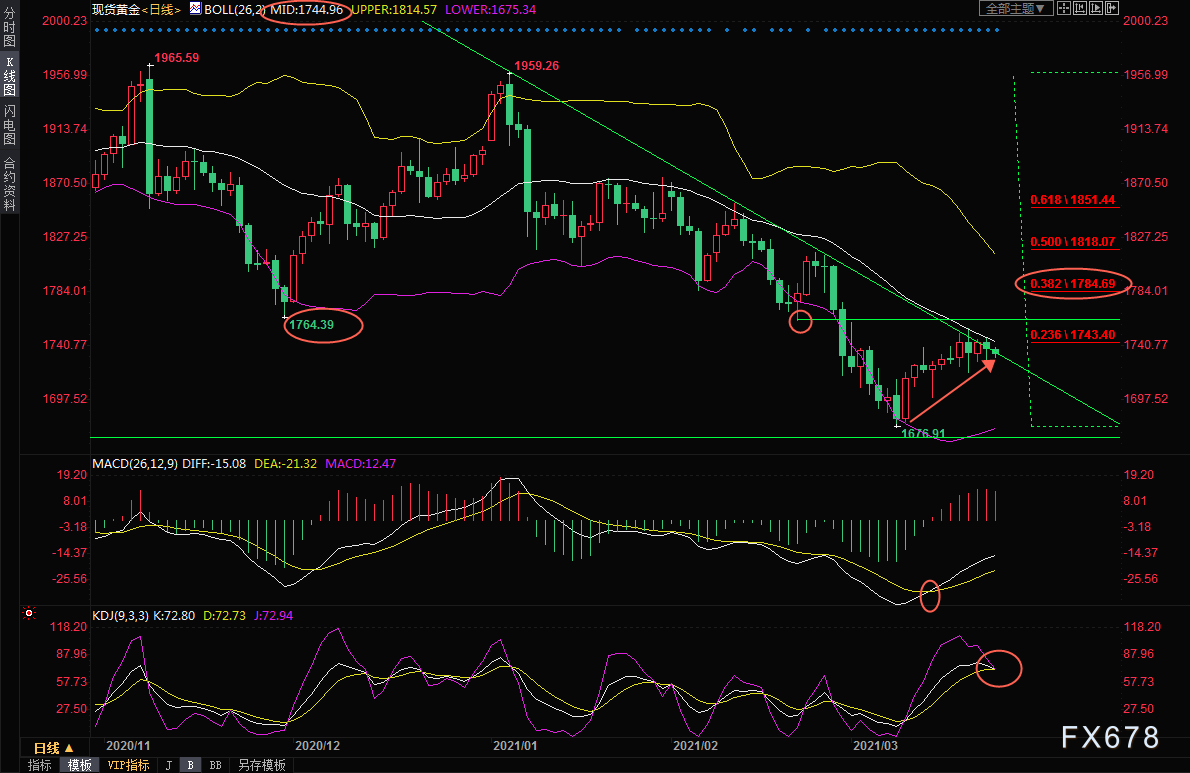 上方布林线中轨阻力目前在1744.97附近,若能顶破该阻力,则增加短线看涨信号,上周高点阻力在1755.49附近,2月19日低点阻力在1760.81附近;仍需顶破1760关口,才能吸引更多的买盘入场。
