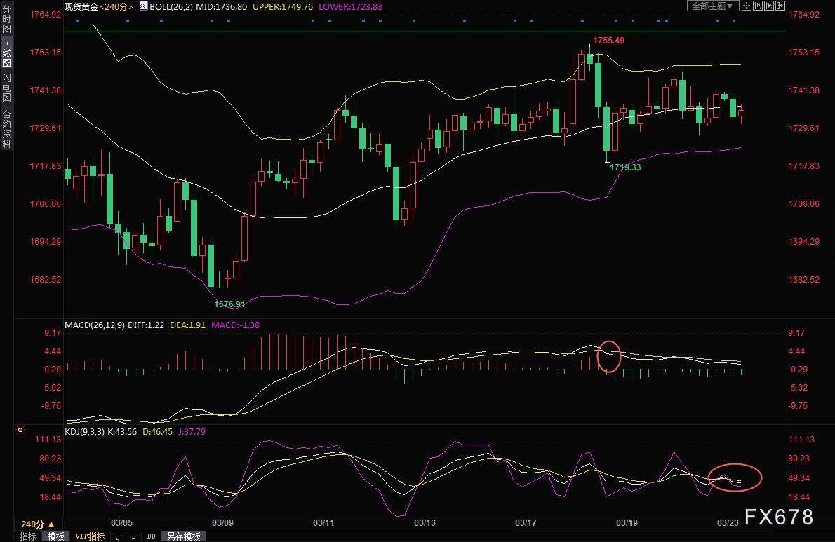 周二(3月23日)亚洲时段,现货黄金震荡微跌,目前交投于1735.37附近,周一美元和美债收益率的走弱给金价提供了一些支撑,但隔夜美股上涨令金价承压。技术面来看,金价受到多重阻力压制,后市略微偏向空头。另外,周二美元出现重拾涨势的迹象,对金价也不利。