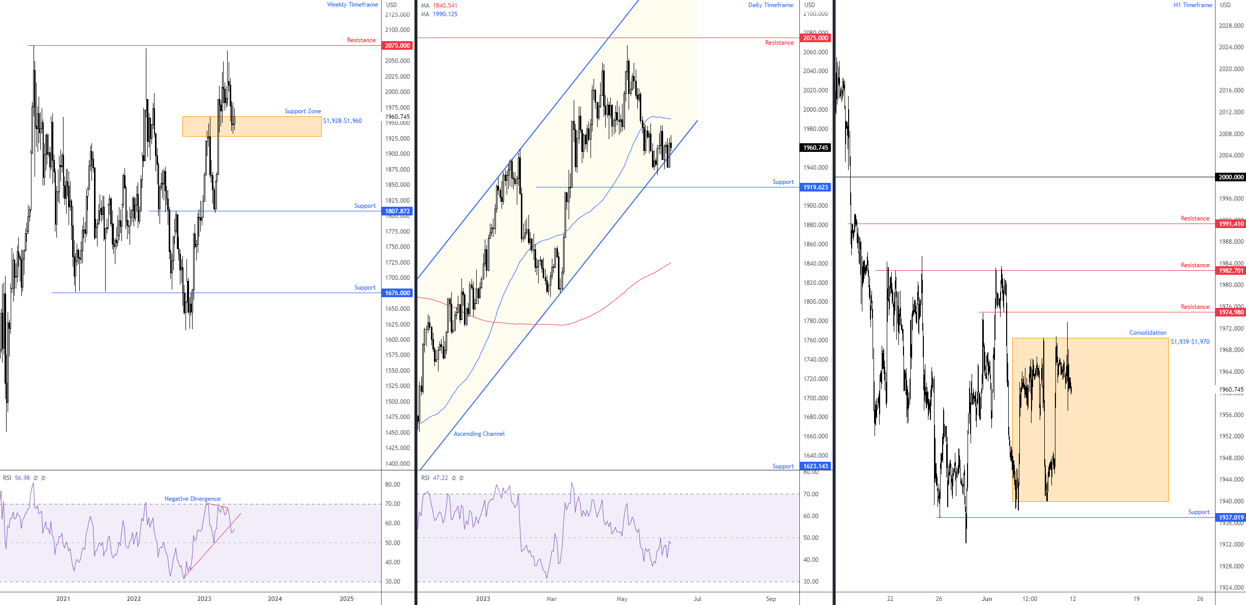 周线图:继5月初接近2075美元的历史高点之后,现货黄金在1928-1960美元有一个活跃的支撑区(尽管是暂时的)。多头在这里有买入需求,尽管目前他们还没有表现出多大的态度。一旦上述支撑区域被跌破,预计金价最低将跌至1807美元。而且,有意思的是,周线图的相对强度指数(RSI)下破了趋势线支撑,表明上行势头可能会继续放缓。