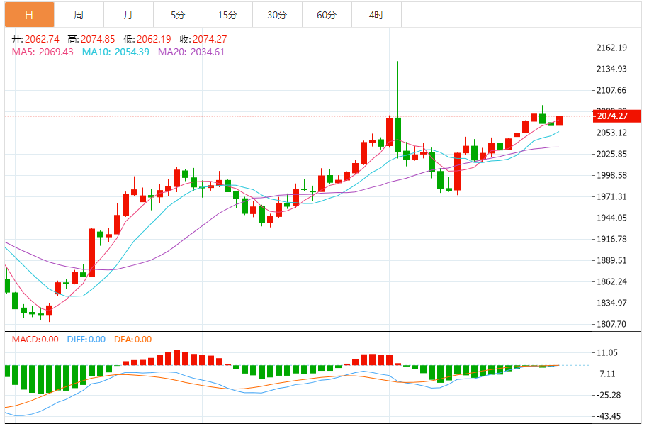 预计,今日金价交投将于支撑位2055.00美元/盎司以及阻力位2090.00美元/盎司之间。