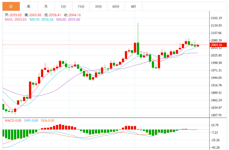 预计,今日金价交投将于支撑位2045.00美元/盎司以及阻力位2075.00美元/盎司之间。