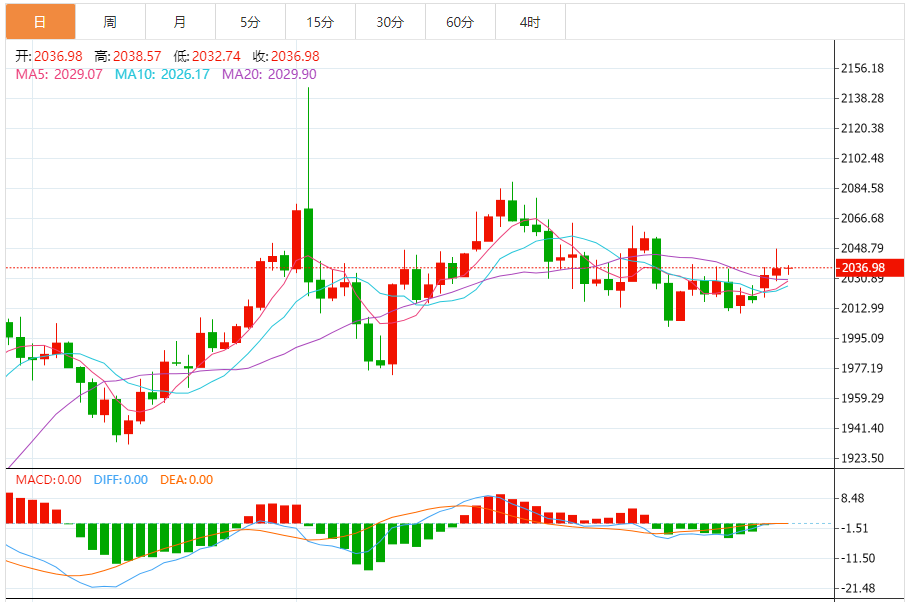 预计,今日金价交投将于支撑位2020.00美元/盎司以及阻力位2050.00美元/盎司之间。