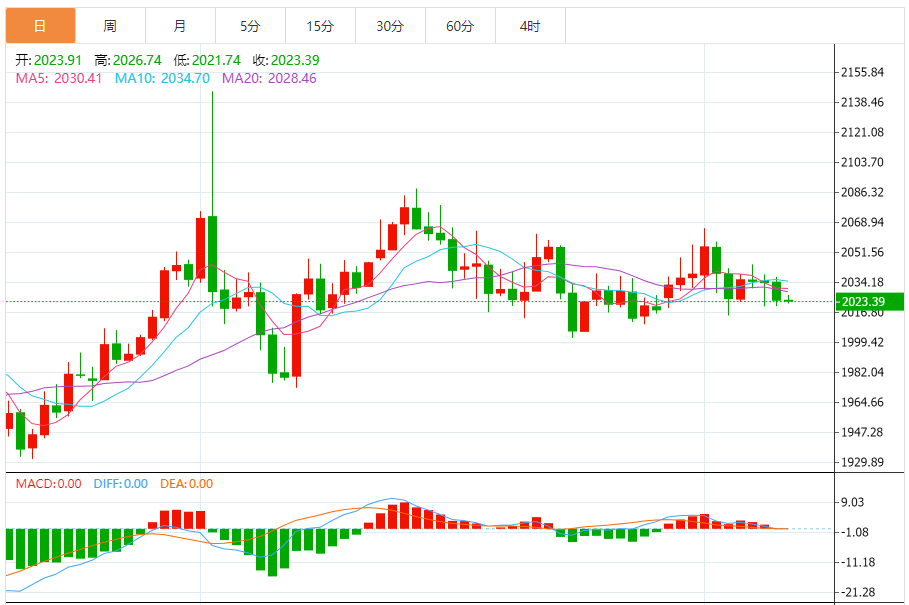 上周金价在一个相对狭窄的通道内波动。现货黄金上周收盘下跌0.74%,收报2024.49美元/盎司。