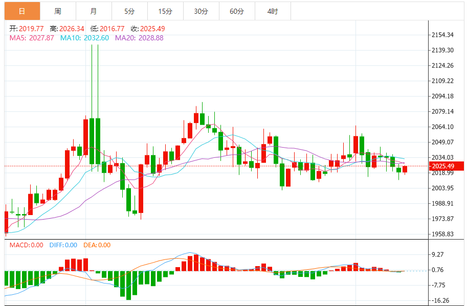 周二(2月13日),现货黄金价格在2025美元附近徘徊,缺乏明确的方向性。在4小时内从底部回升,盘中报2025.17美元,涨幅0.27%。
