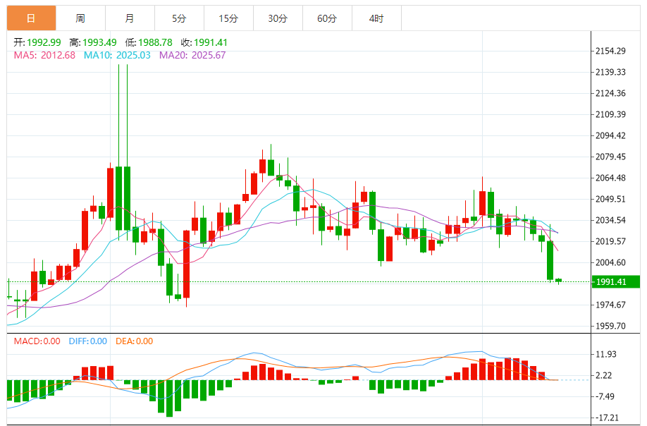 现货黄金周二收盘暴跌26.93美元,跌幅1.33%,收报1992.97美元/盎司。