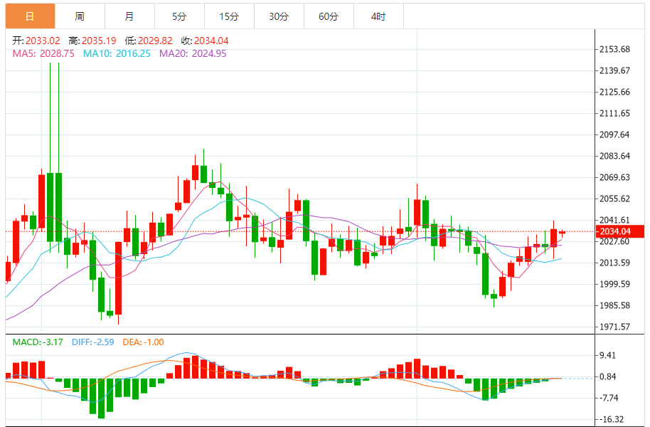 预计,今日金价交投将于支撑位2015.00美元/盎司以及阻力位2050.00美元/盎司之间。