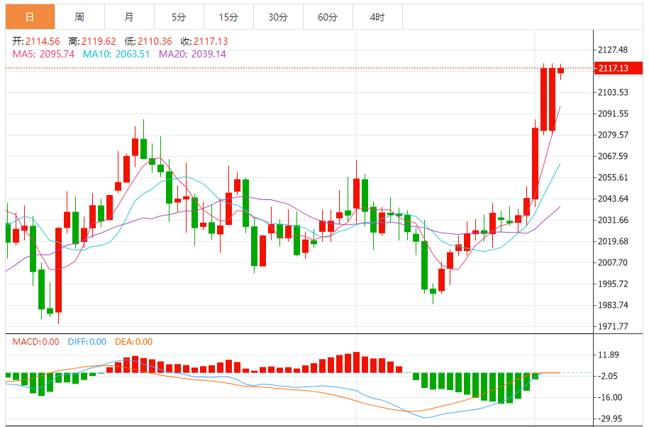 现货黄金周一收盘飙升31.41美元,涨幅1.51%,收报2114.23美元/盎司。金价盘中最高触及2119.89美元/盎司。