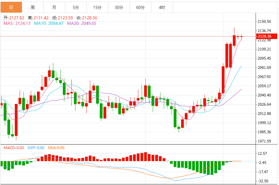 预计,今日金价交投将于支撑位2105.00美元/盎司以及阻力位2140.00美元/盎司之间。