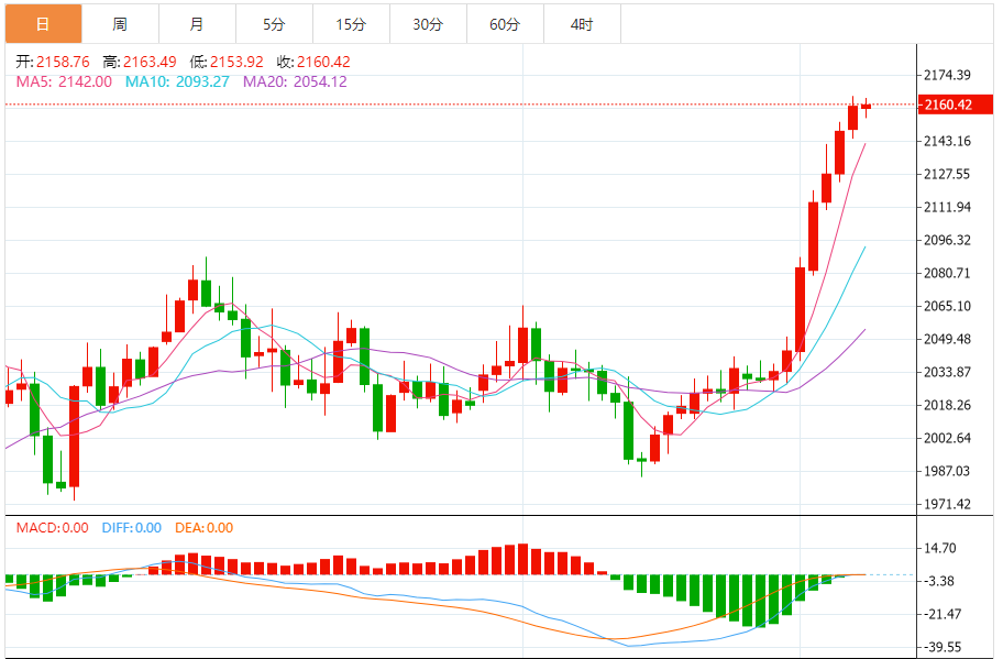 现货黄金周四收盘攀升11.55美元,涨幅0.54%,收报2159.57美元/盎司。金价盘中触及2164.79美元/盎司的历史新高。