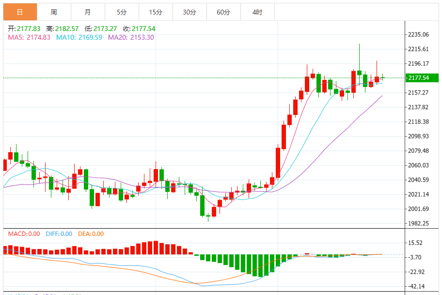 现货黄金周二收盘上涨0.31%,收报2178.55美元/盎司。金价盘中最高触及2200.15美元/盎司。