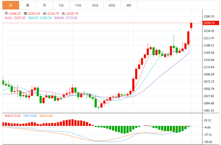 金价周一亚市盘中最高触及2265.69美元/盎司,刷新历史高位。