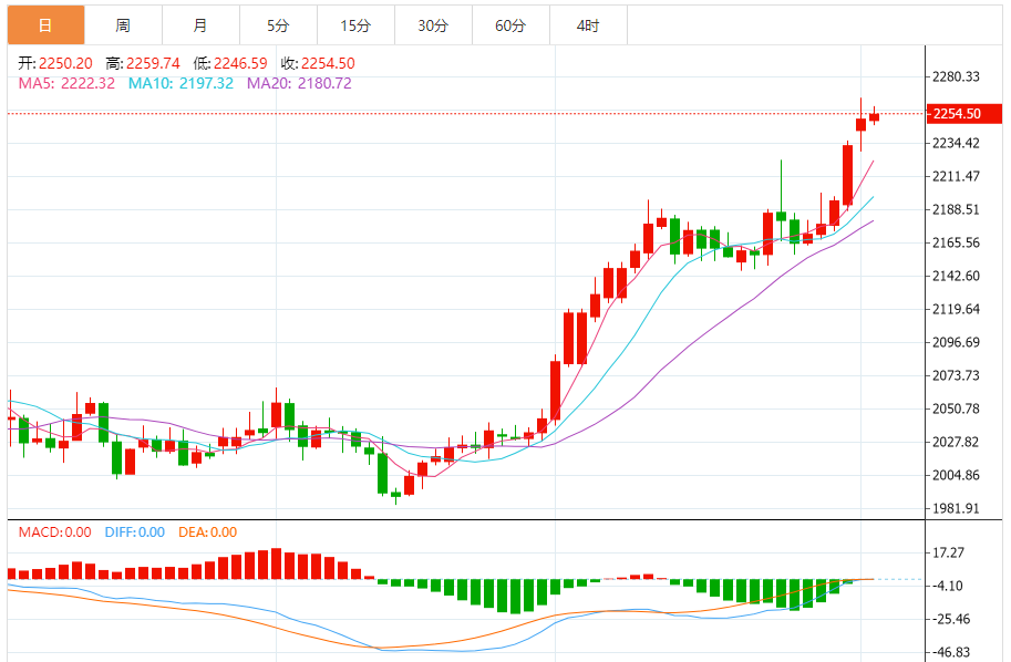 现货黄金价格周一收盘大涨17.75美元,涨幅0.8%,收报2250.49美元/盎司。金价周一盘中飙升2265.69美元/盎司,创下历史高点。