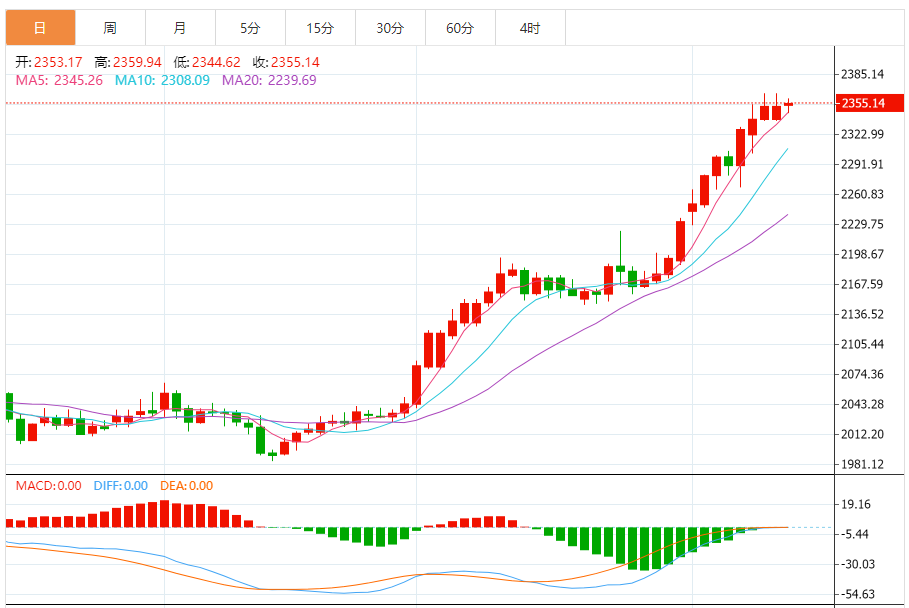 现货黄金周二收报2352.15美元/盎司,涨幅0.57%,盘中触及2365.34美元/盎司,创下历史新高。