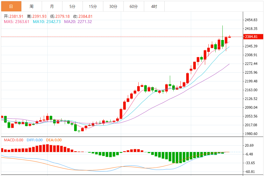 预计,今日金价交投将于支撑位2370.00美元/盎司以及阻力位2410.00美元/盎司之间。