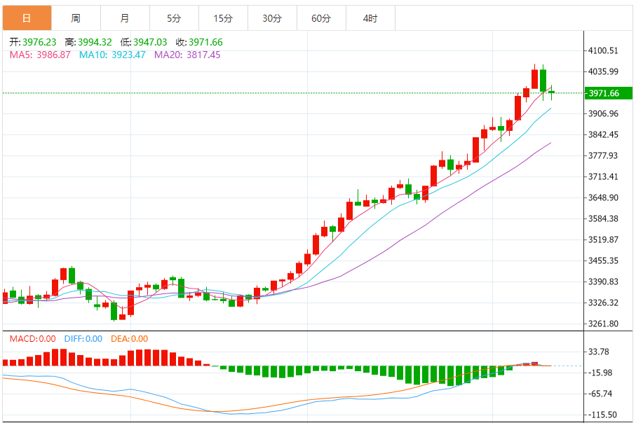 周四(10月9日)纽约尾盘,现货黄金下跌1.62%,报3976.76美元/盎司,北京时间21:11(美股开盘之前不久)涨至4057.97美元——试探10月8日所创历史最高位4059.31美元,00:00开始加速下跌,01:16跌至3944.91美元、逼近10月7日底部3941美元,结束此前连续四个交易日上涨的趋势。COMEX黄金期货跌1.96%,报3990.90美元/盎司,日内交投区间为4077.90-3957.90美元,也“上探10月8日所创盘中历史最高位4081美元无果”。