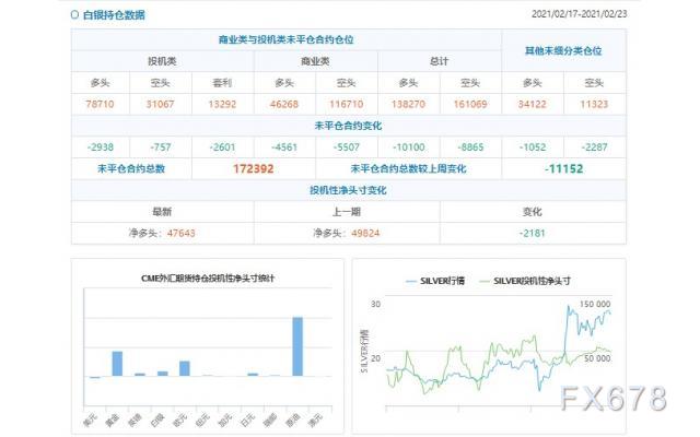 2、投机者持有的白银投机性净多头减少2181手合约,至47643合约,表明投资者看多白银的意愿降温。