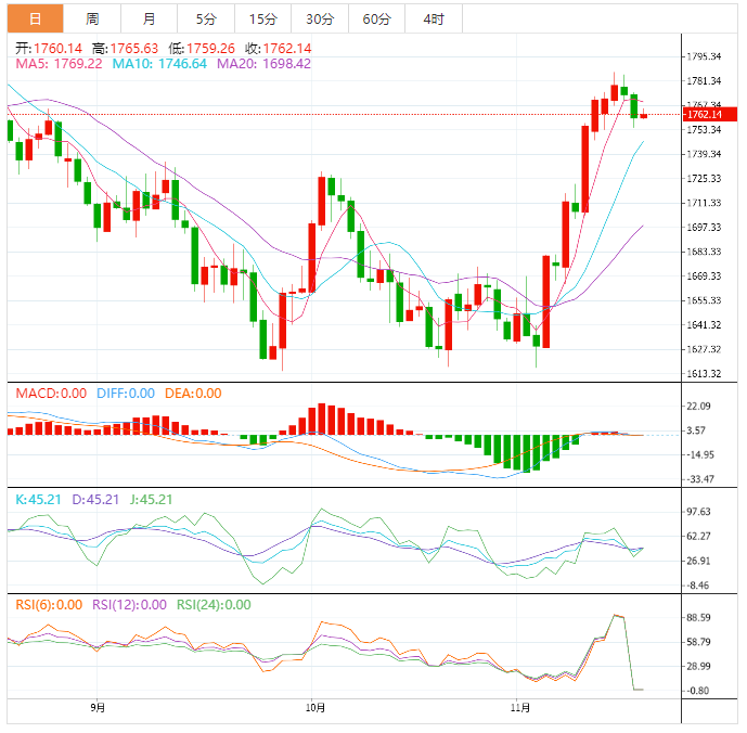 也就是说,最近突破的阻力位转变为支撑位,接近1760美元,高于09-15年11月上行时38.2%的斐波那契回档位,约1754美元,限制了金价的立即下行。