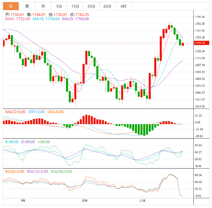 周二盘中,黄金交投于1742.51附近。金价周一下滑至逾一周最低,跌幅超过1%,因为美元扩大涨幅,而市场关注点转向美联储将公布的11月会议记录。本周因公共假期交易时间缩短。现货银下跌0.3%,至每盎司20.85美元,铂金上涨0.8%,至每盎司985.13美元。钯金下跌4%,至每盎司1860.26美元,稍早跌至一周最低1,823美元。