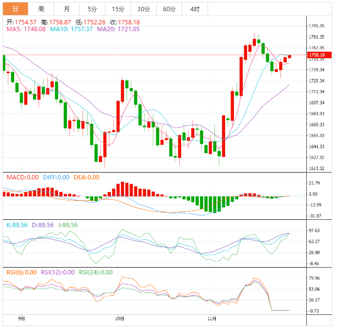 市场利多因素要多余利空因素,在跌破1735关键支撑前,金价后市偏向震荡上行,关注11月18日高点1767.58和近期高点1786.70附近阻力。