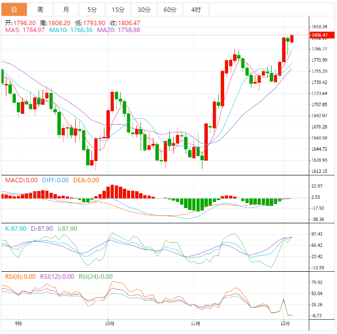 金价整理接近11月15日高点1,777.32美元后,已获得强劲买盘。 金价寻求重测三个月来的高点1,805.00美元附近。 金价已经突破了20期指数均线(EMA)所处水平1,795.90美元,在此之前,黄金价格已经在处在1,790.00美元附近的50均线获得支撑,表明金价短线倾向于上涨。