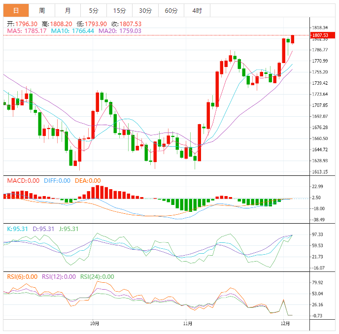 在新一周开始时,金价接近1800美元以上的五个月最佳水平,尽管美国非农就业数据大幅下滑,但风险状况改善和美联储鸽派预期继续对美元构成压力。上周五发布的最新数据显示,美国经济11月份新增就业26.3万个,高于20万个,但低于10月份的28.4万个。